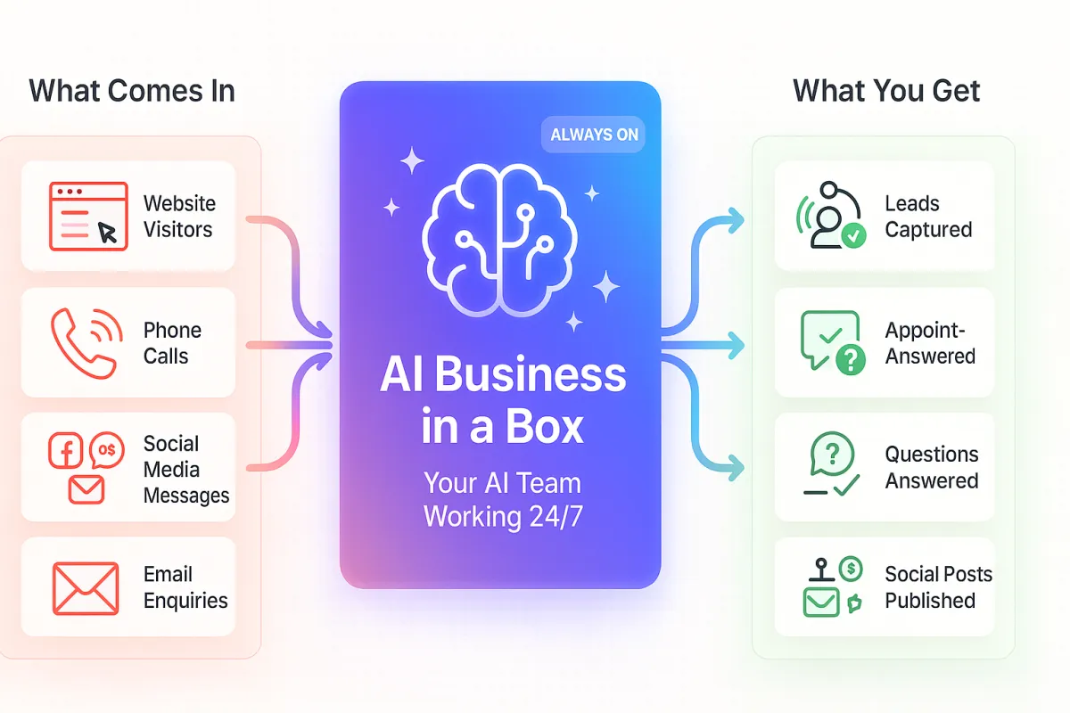 Our AI-powered Business in a Box replaces disjointed tools with one seamless system looking after leads, bookings, follow-ups, social media, complex tasks all done-for-you and always on.
